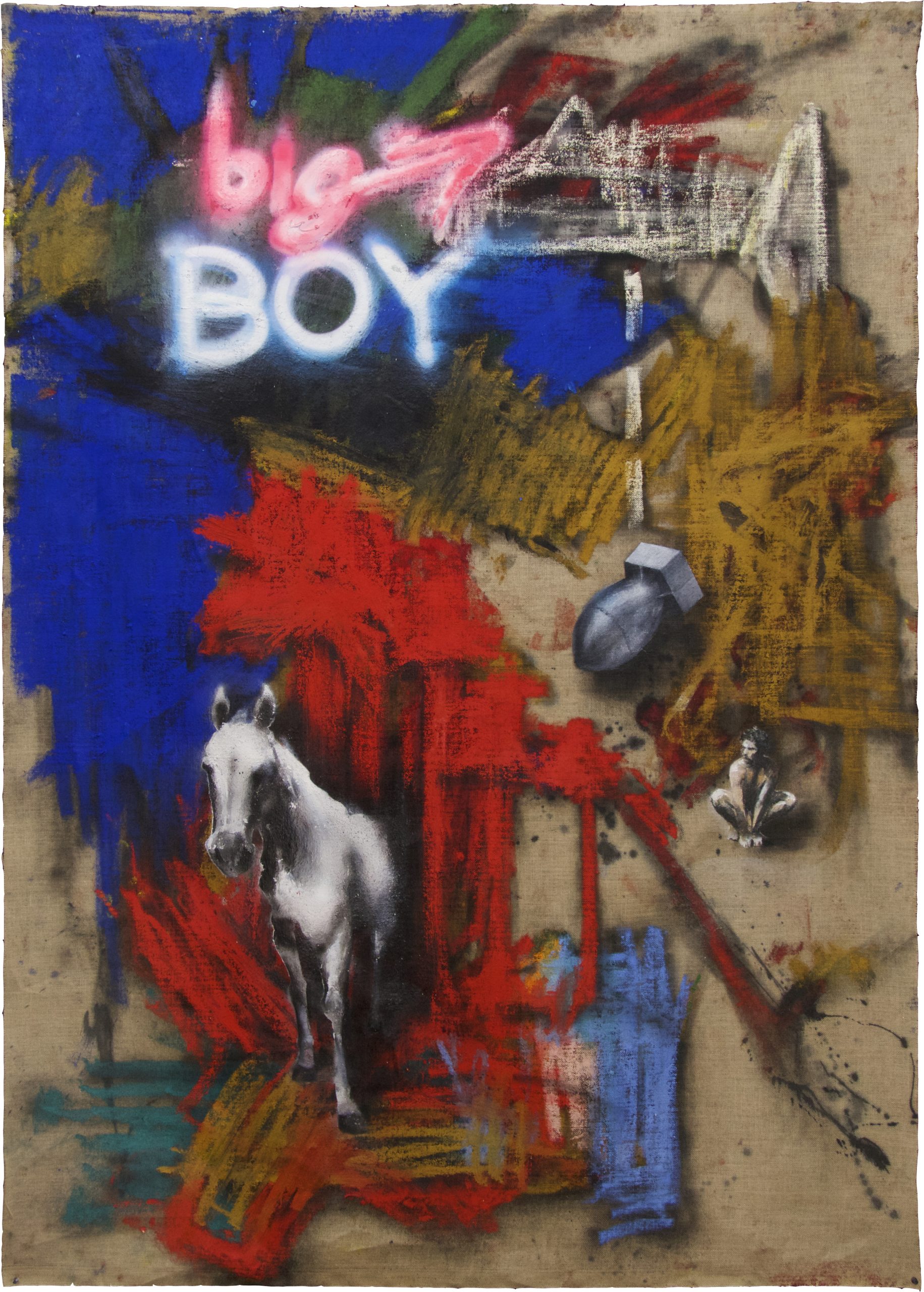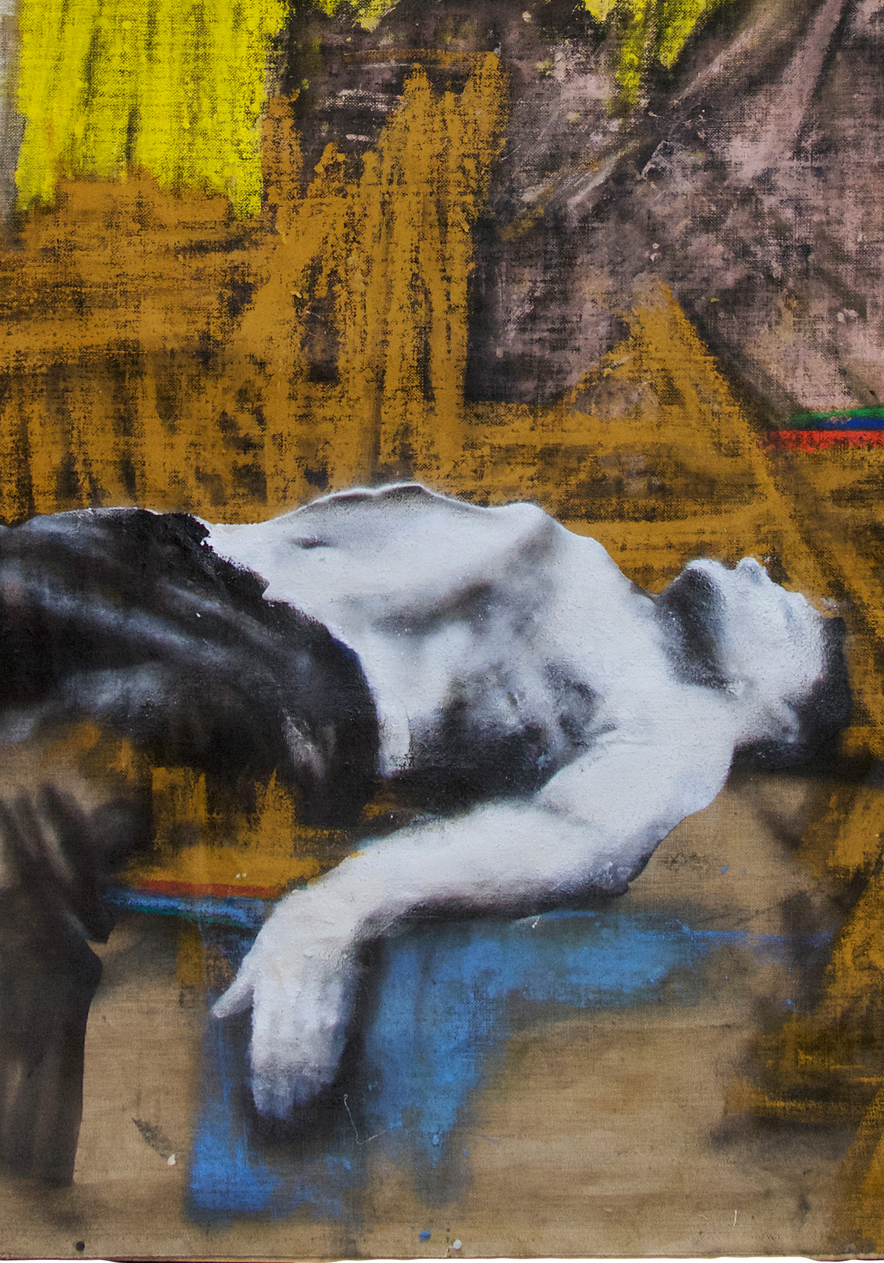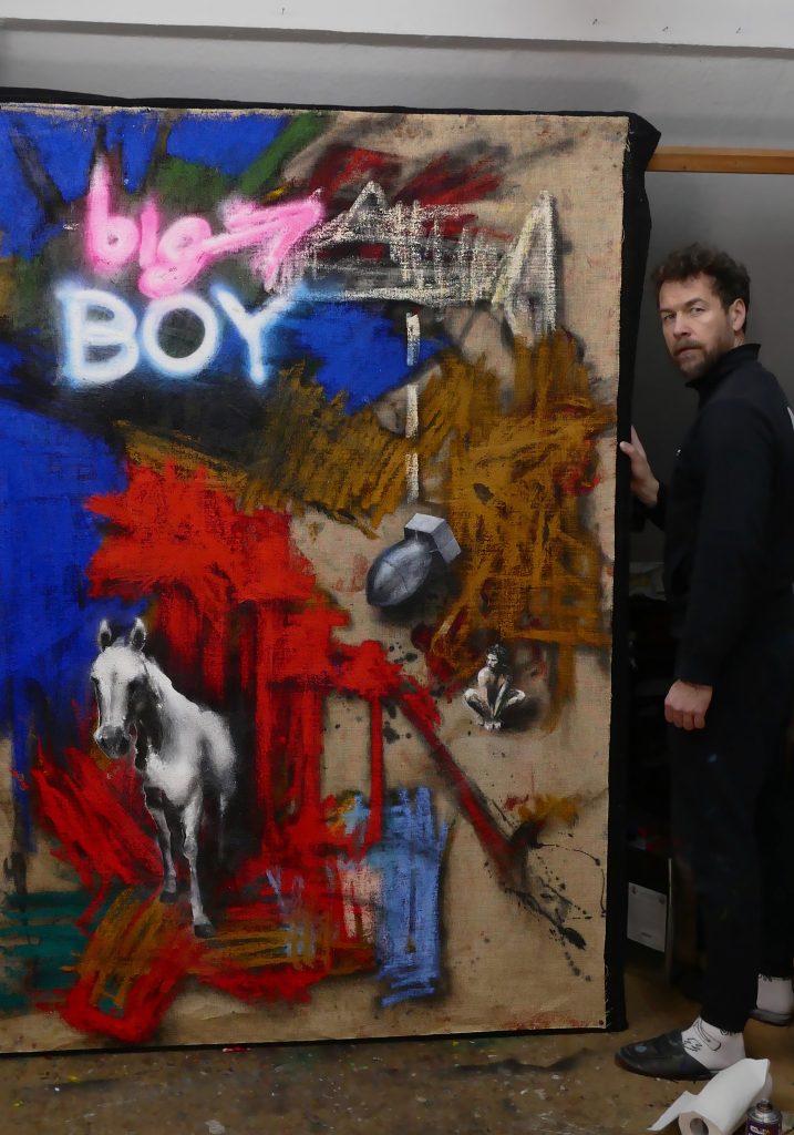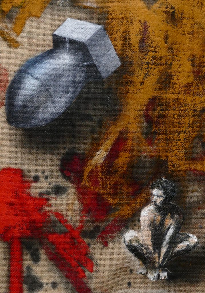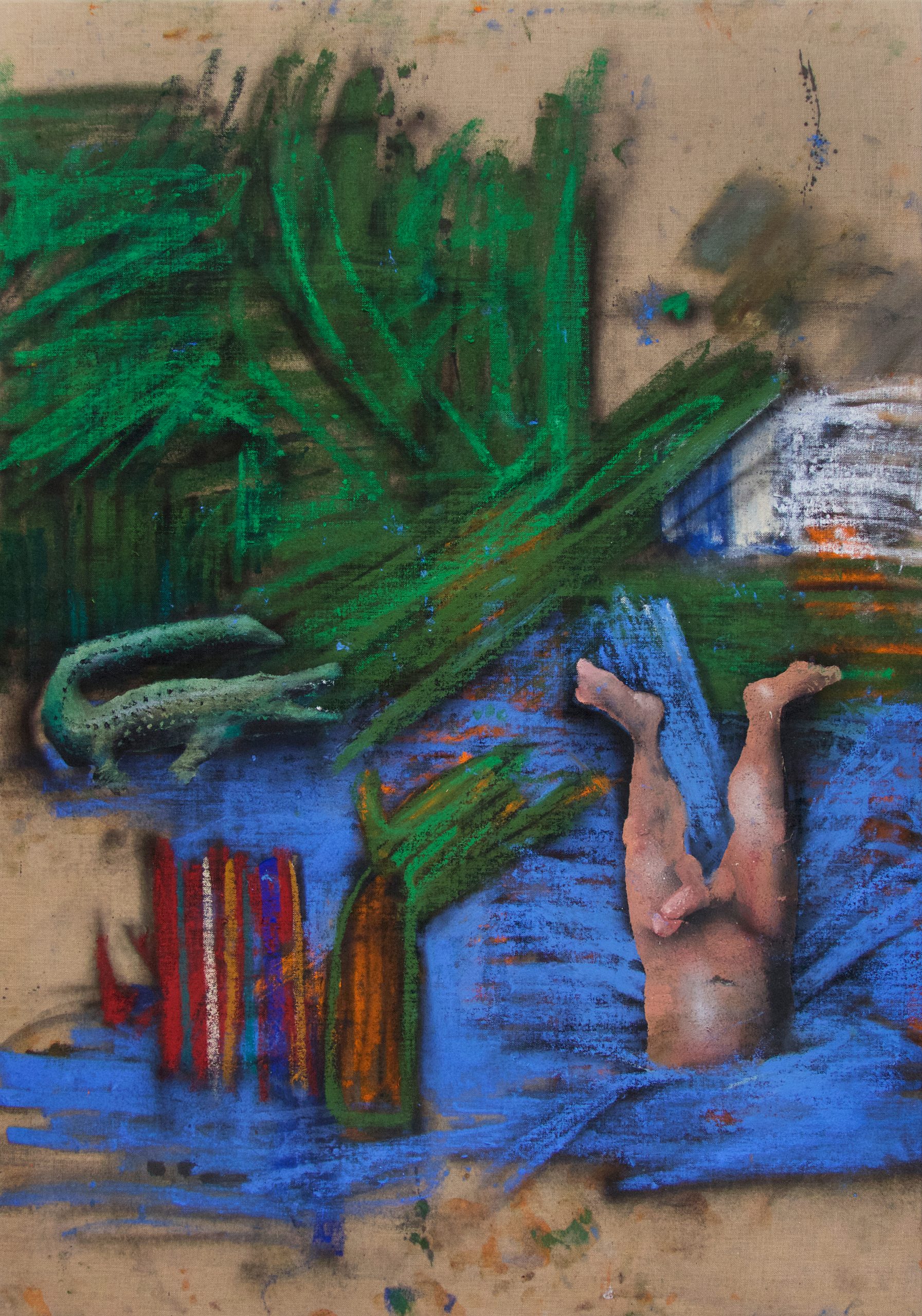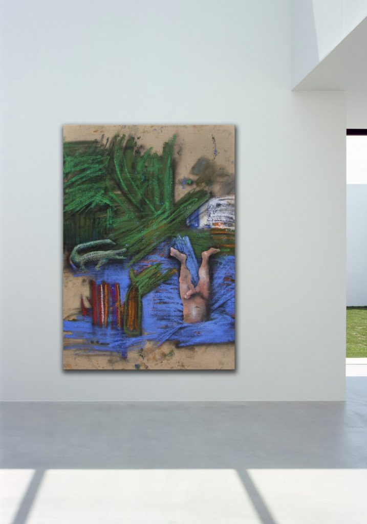The decisive difference to my previous work in this series is the fact that at the beginning of the painting process I have no idea what the painting will ultimately look like. Apart from the intention to paint a picture, there is initially neither a basic thematic nor compositional idea. It all begins with me sitting on the raw canvas and producing random, child-like scribbles. Occasionally I look at the scribbles from a distance or different angles until something in them evokes the first figurative association. It seems as if from then on the picture itself tells me what it wants to become. Consequently, I try to follow the chain of ideas it evokes and force myself to bring every spark of thought onto the canvas.