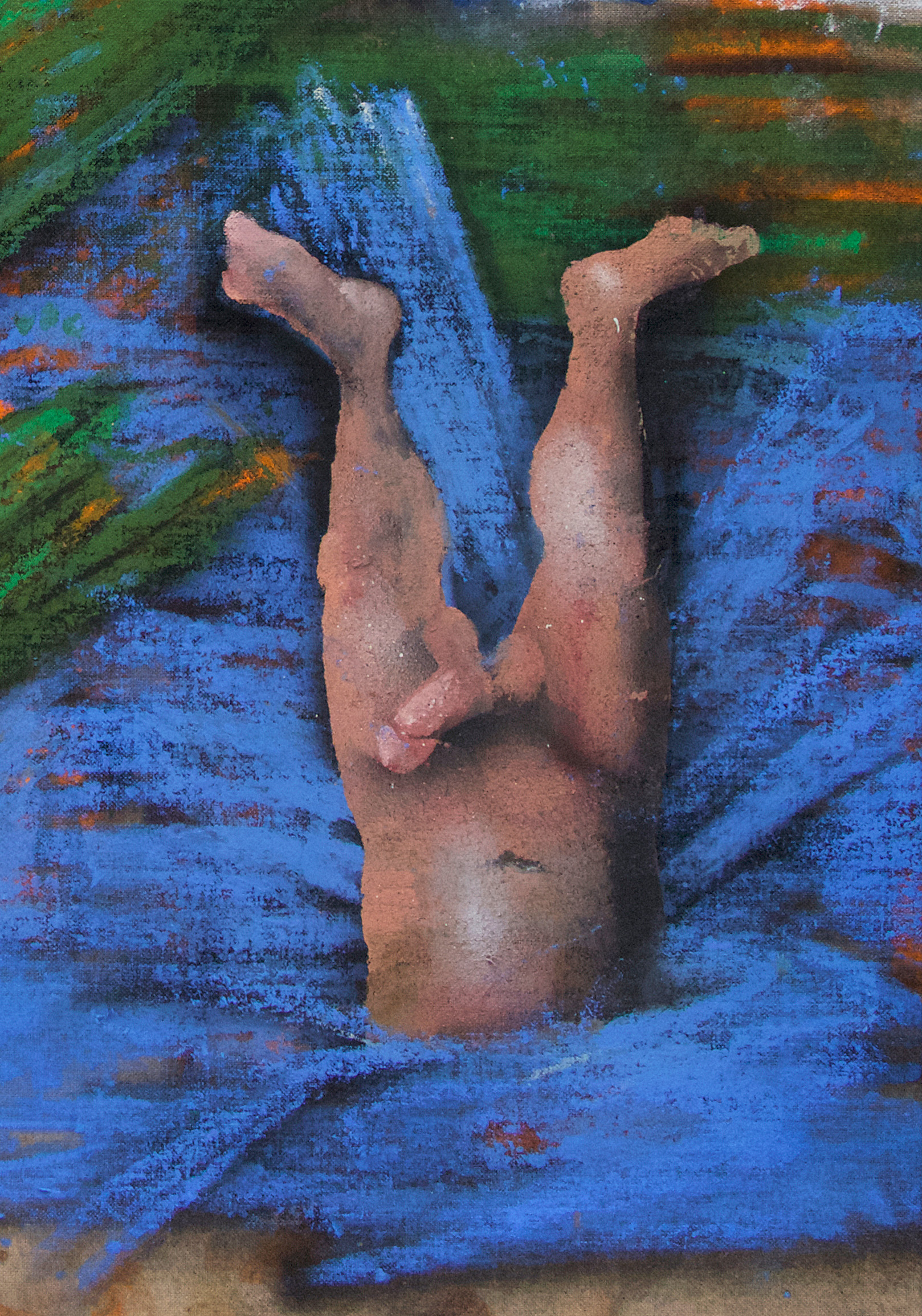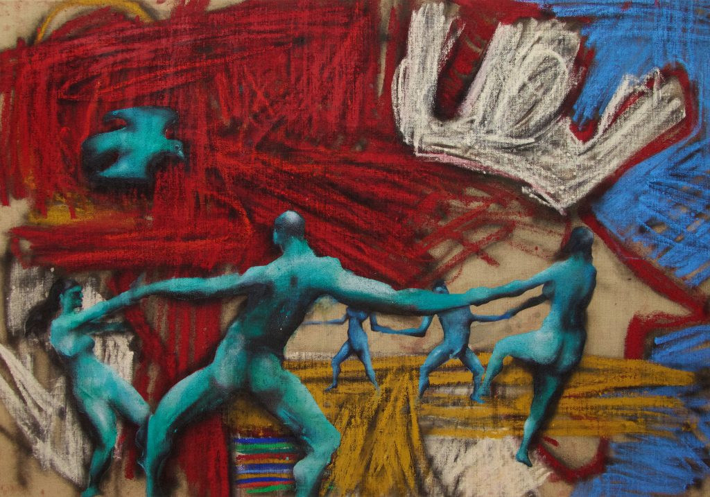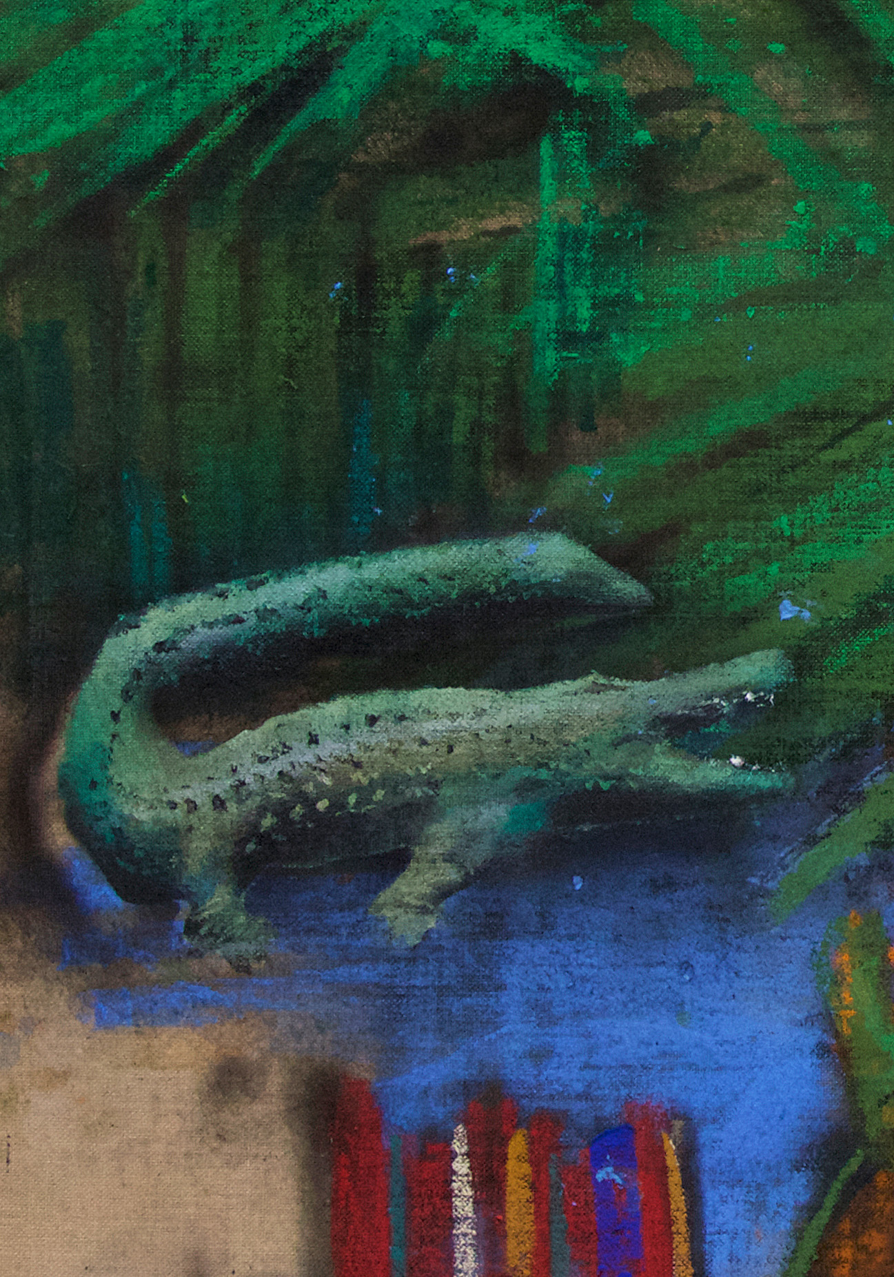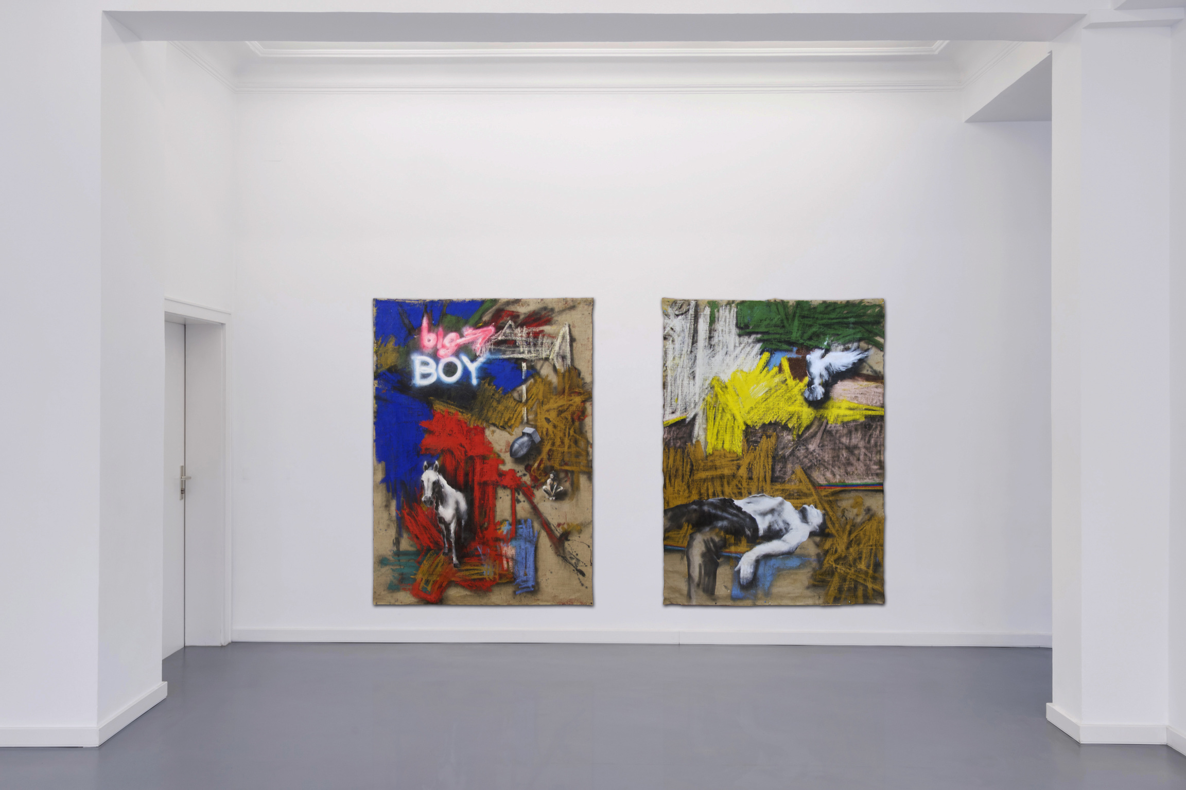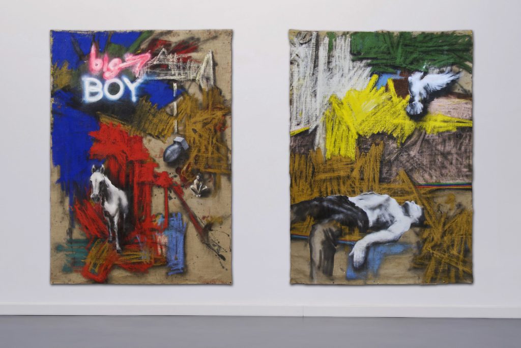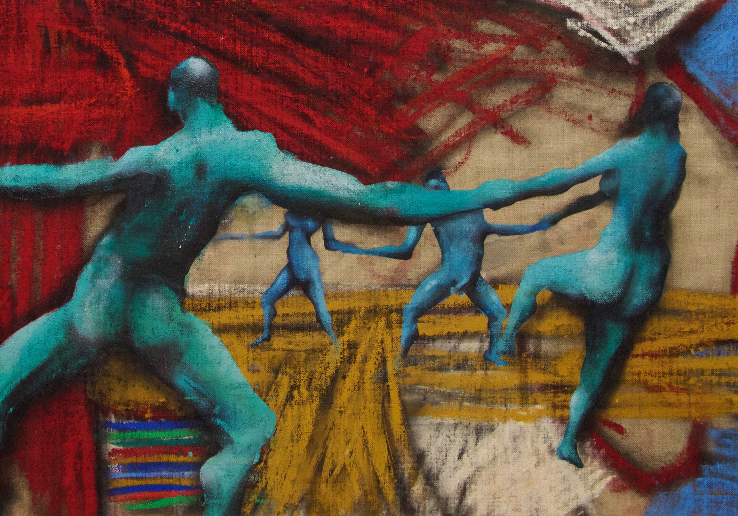The decisive difference to my previous work in this series is the fact that at the beginning of the painting process I have no idea what the painting will ultimately look like. Apart from the intention to paint a picture, there is initially neither a basic thematic nor compositional idea. It all begins with me sitting on the raw canvas and producing random, child-like scribbles. Occasionally I look at the scribbles from a distance or different angles until something in them evokes the first figurative association. It seems as if from then on the picture itself tells me what it wants to become. Consequently, I try to follow the chain of ideas it evokes and force myself to bring every spark of thought onto the canvas.