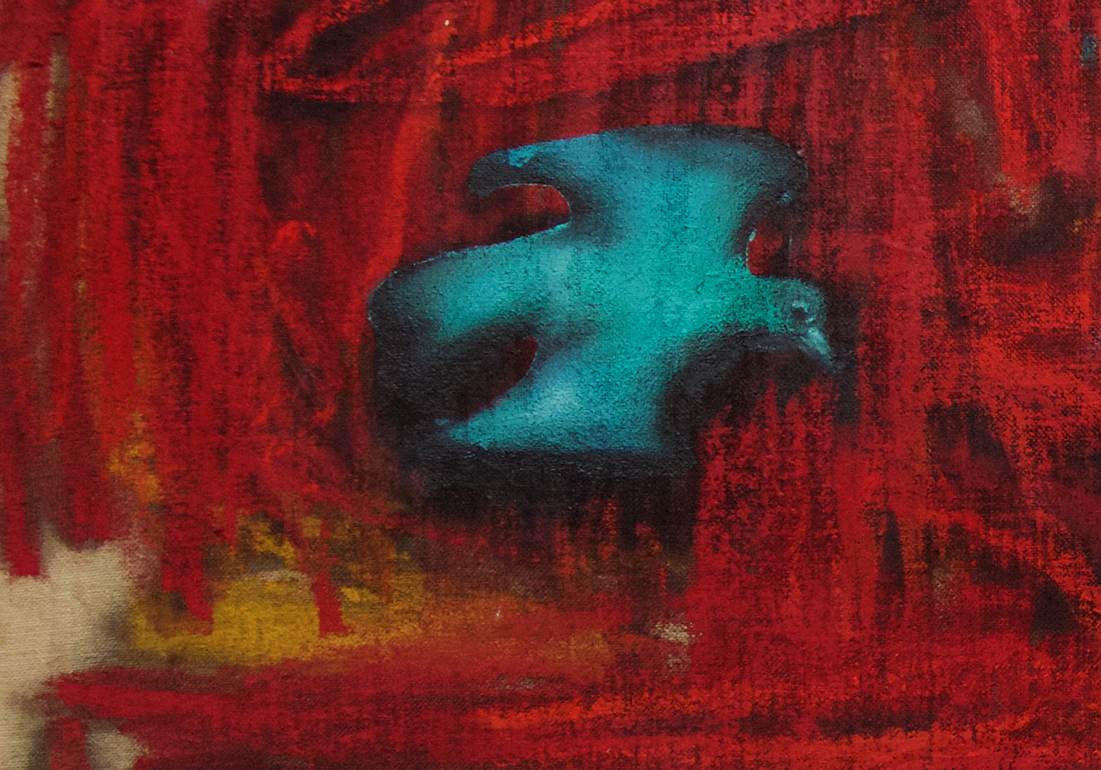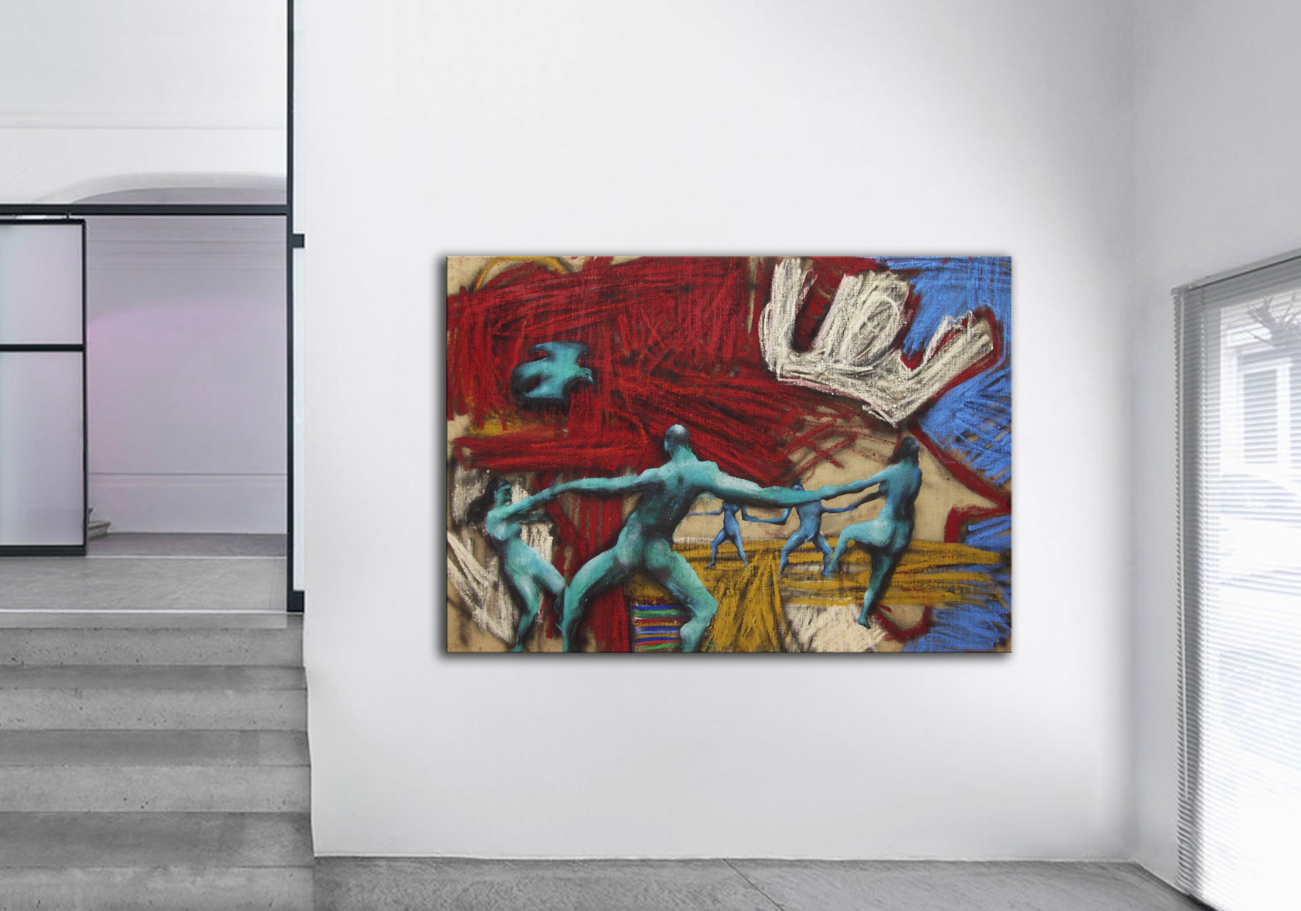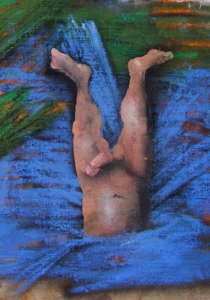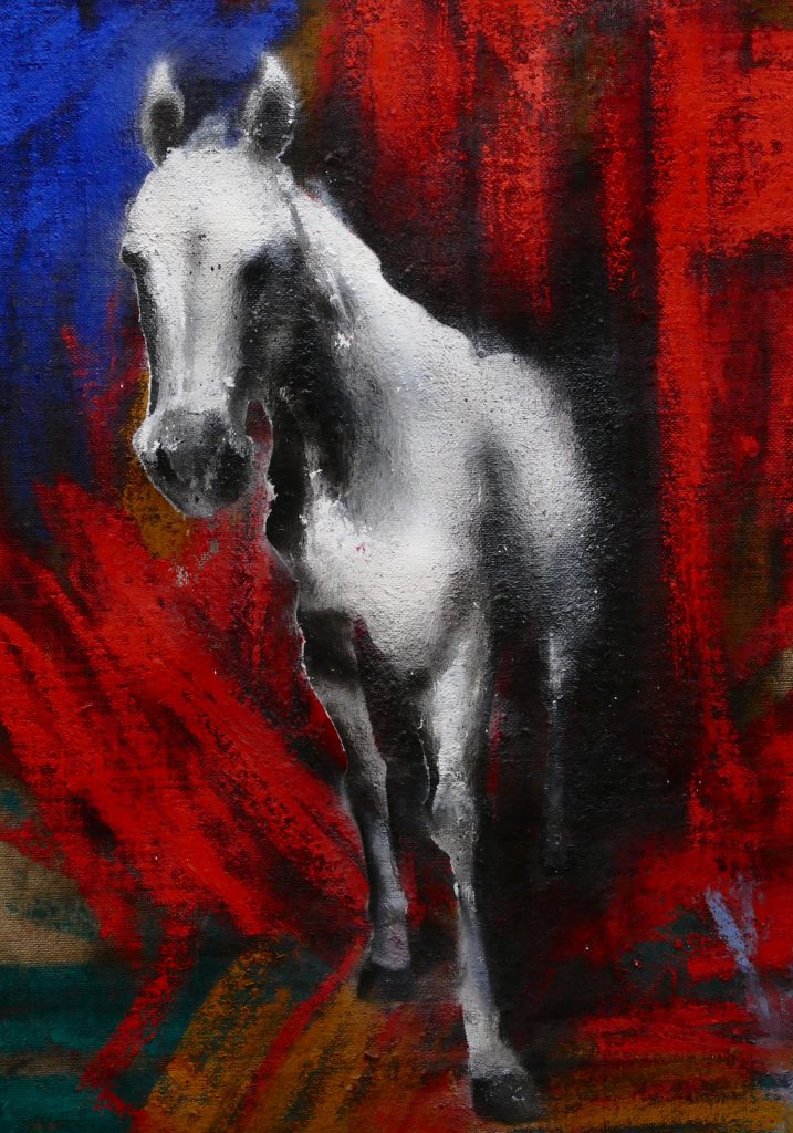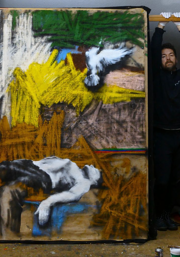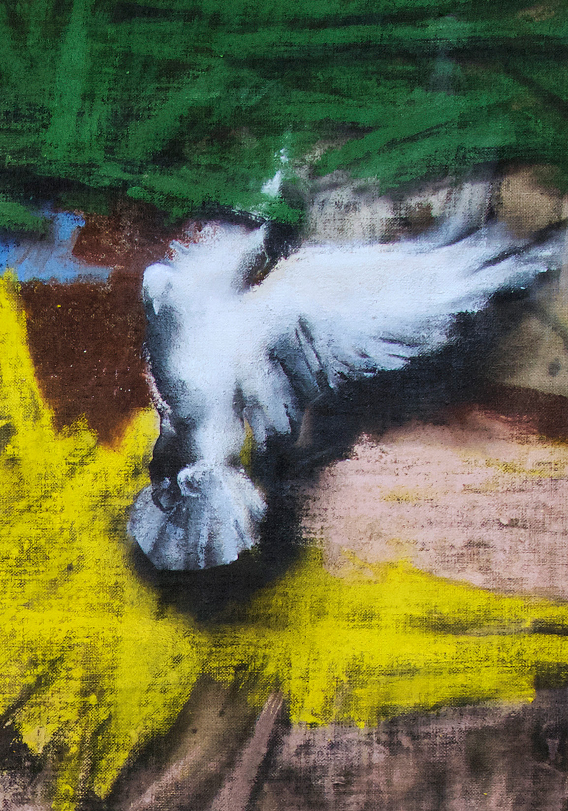 The decisive difference to my previous work in this series is the fact that at the beginning of the painting process I have no idea what the painting will ultimately look like. Apart from the intention to paint a picture, there is initially neither a basic thematic nor compositional idea. It all begins with me sitting on the raw canvas and producing random, child-like scribbles. Occasionally I look at the scribbles from a distance or different angles until something in them evokes the first figurative association. It seems as if from then on the picture itself tells me what it wants to become. Consequently, I try to follow the chain of ideas it evokes and force myself to bring every spark of thought onto the canvas.
