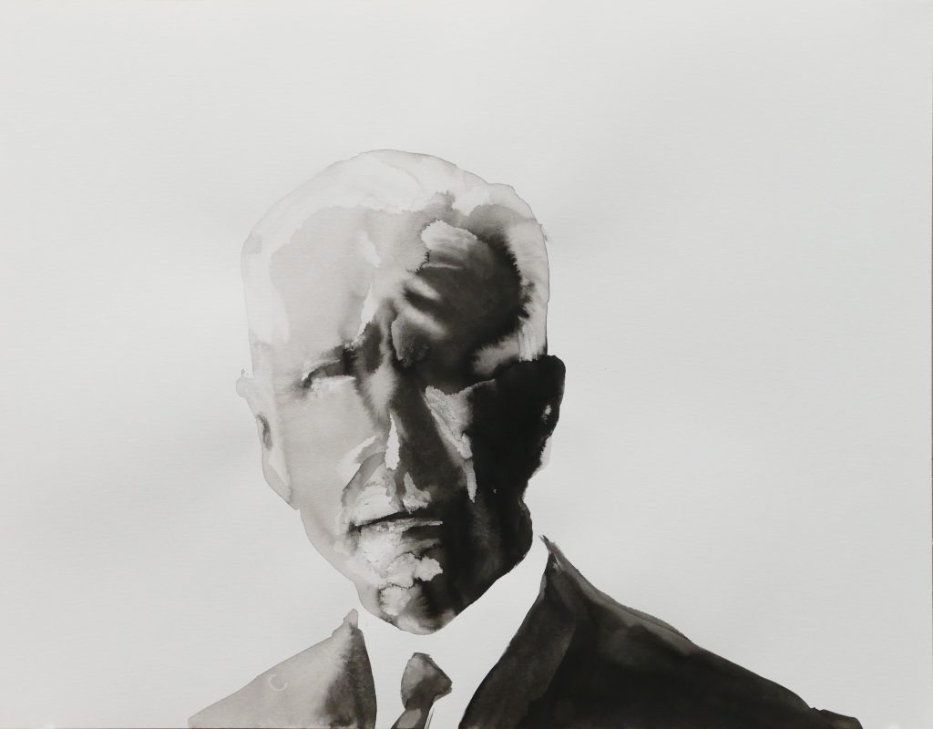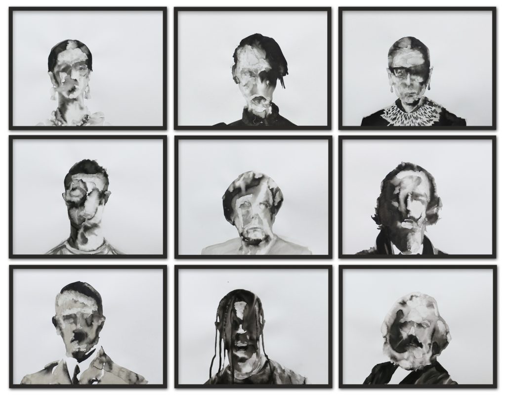 If I ask the same question out into the cosmos, I will get a very similar reaction. However, in the second case, the silence is vacuum-induced, perpetual and far less funny. Because for our universe (the visible part of which contains 70 trillion sun-like stars) Frida and Vladimir are completely equal, furthermore equally insignificant! The basic idea for my portrait series with the corresponding title „Space Forgets Everybody“ is derived from this very principle of cosmic indifference. Here I portray various personalities with watery ink and exhibit them in randomly composed groups. In this way, historical figures of light appear on the wall alongside serial killers, professional athletes alongside dictators and actors alongside politicians on an unusually equal footing. Due to the special painting technique, their faces appear fleeting, in the process of dissolving, but still just identifiable to the viewer. Due to the lack of thematic cohesion, their common denominator is ultimately reduced to the human condition and its transience. The universe forgets us all, regardless of who we are or were when we were alive.